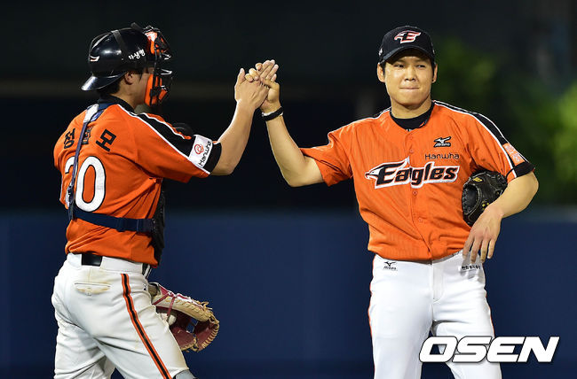 경기 종료 후 한화 정범모와 박정진이 승리의 기쁨을 나누고 있다. /sunday@osen.co.kr