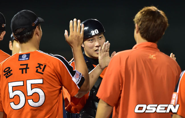 경기 종료 후 한화 정범모가 동료들과 승리의 기쁨을 나누고 있다. /sunday@osen.co.kr
