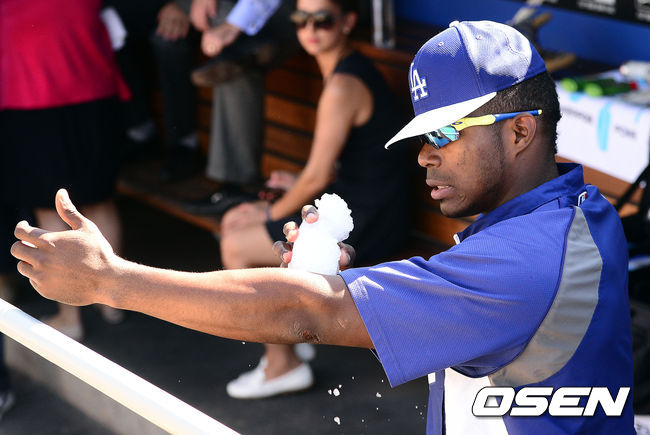 1일(한국시간) 미국 캘리포니아주 로스앤젤레스 다저스타디움에서 열리는 '2014 메이저리그' LA 다저스와 애틀란타 브레이브스의 경기에 앞서 다저스 푸이그가 얼음을 가지고 장난을 치고 있다.