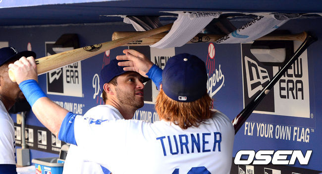 경기전 다저스 부테라와 터너가 라미레즈 전용 배트 공간을 만들고 있다.