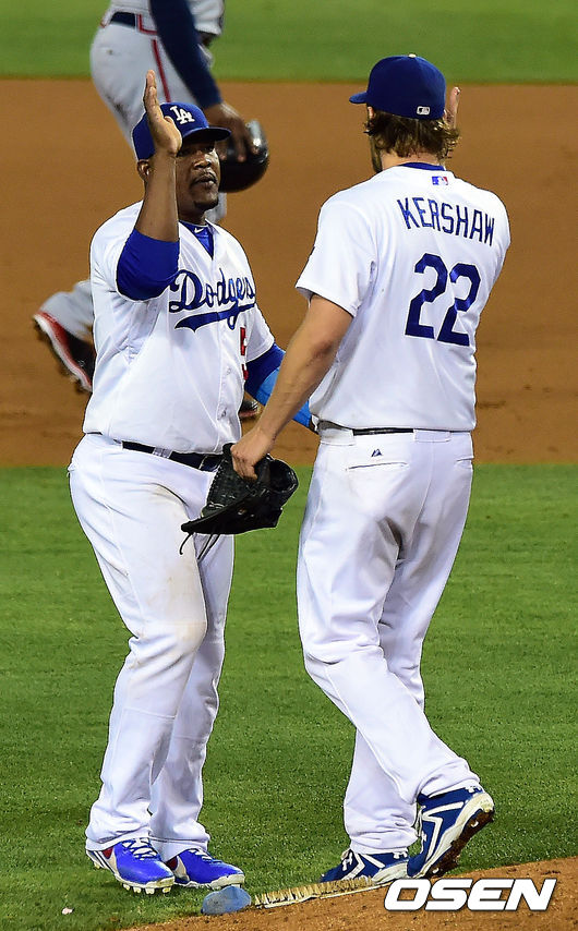 완투승을 거둔 다저스 커쇼가 유리베와 하이파이브를 하고 있다./youngrae@osen.co.kr