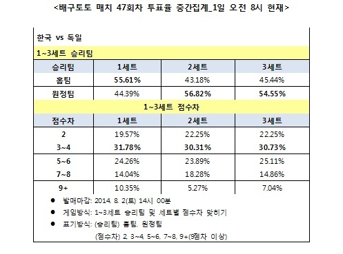 1~3세트 승리팀과 점수차를 맞히는 배구토토 매치 게임에서 세트별 예상 승리팀은 1세트 한국 승리(55.61%), 2세트 독일 우세(56.82%), 3세트 독일 승리(54.55%)로 나타나 1세트에서는 한국이, 2, 3세트에서는 독일이 우세할 것으로 예상됐다.