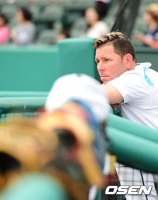 1일 오후 대전구장에서 열리는 '2014 한국야쿠르트 세븐 프로야구' 한화 이글스와 두산 베어스의 경기를 앞두고, 선발로 나서는 두산 새 외국인 투수 마야가 선수들의 훈련을 지켜보고 있다.