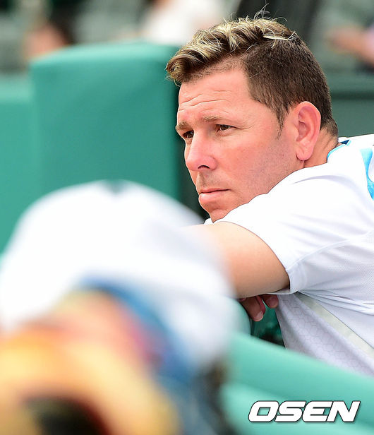 1일 오후 대전구장에서 열리는 '2014 한국야쿠르트 세븐 프로야구' 한화 이글스와 두산 베어스의 경기를 앞두고, 선발로 나서는 두산 새 외국인 투수 마야가 선수들의 훈련을 지켜보고 있다.