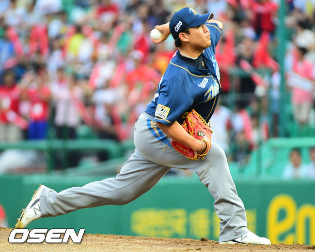 1일 오후 인천 문학구장에서 열린 '2014 한국야쿠르트 세븐 프로야구' SK 번스와 NC 다이노스의 경기, 1회말 NC 선발 노성호가 힘차게 공을 뿌리고 있다.