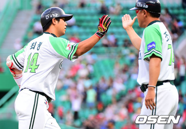 1일 오후 인천 문학구장에서 열린 '2014 한국야쿠르트 세븐 프로야구' SK 번스와 NC 다이노스의 경기, 1회말 2사 주자없는상황에서 솔로포를 때린 최정이 그라운드를 돌며 조원우 코치와 하이파이브를 나누고 있다.