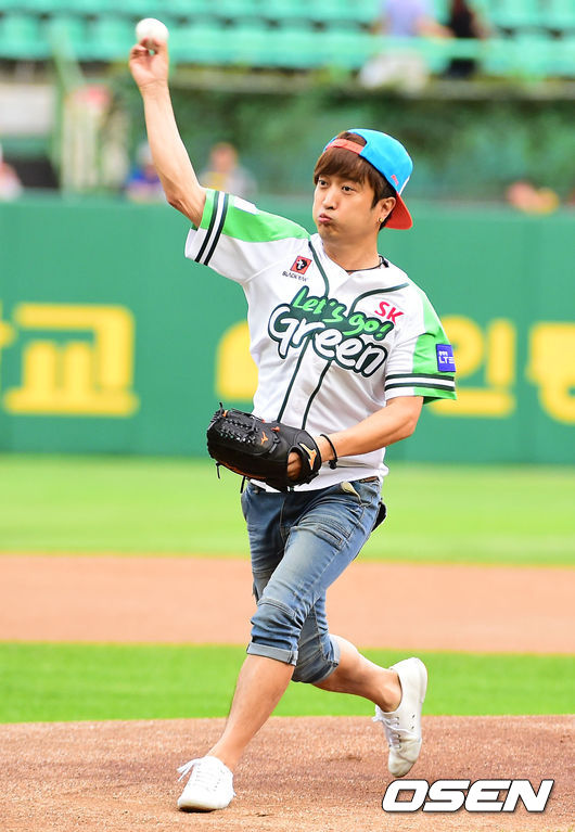 1일 오후 인천 문학구장에서 열린 '2014 한국야쿠르트 세븐 프로야구' SK 번스와 NC 다이노스의 경기에 앞서 개그맨 정명훈이 시구를 하고 있다.
