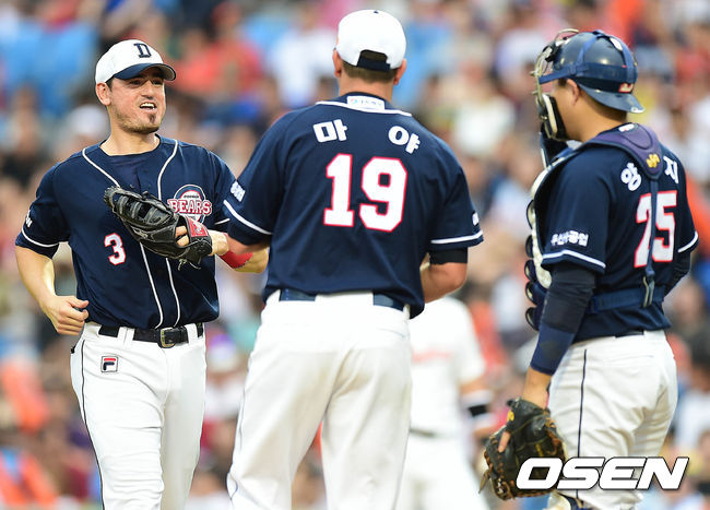 2회말 한화 공격 1사 1, 2루 상황 두산 새 외국인 투수 마야와 포수 양의지가 대화를 나누던 중 칸투가 대화를 돕기 위해 마운드로 향하고 있다.