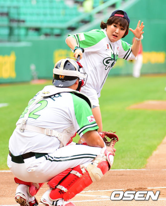 1일 오후 인천 문학구장에서 열린 '2014 한국야쿠르트 세븐 프로야구' SK 번스와 NC 다이노스의 경기에 앞서 시타를 맡은 개그맨 이수지가 놀란표정을 짓고 있다.