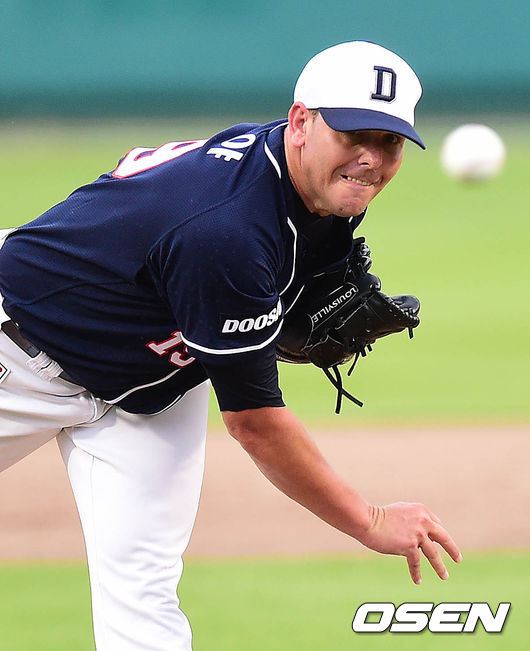 선발로 나서는 두산 새 외국인 투수 마야가 힘차게 공을 뿌리고 있다.