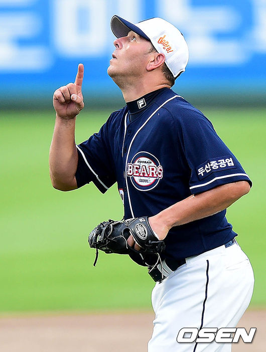 1회말 한화 공격을 무실점으로 막아낸 두산 새 외국인 투수 마야가 더그아웃으로 들어가며 세리머니를 펼치고 있다.