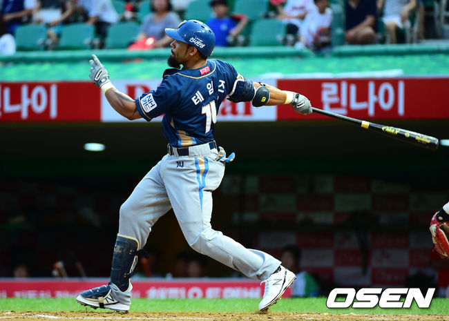 1일 오후 인천 문학구장에서 열린 '2014 한국야쿠르트 세븐 프로야구' SK 번스와 NC 다이노스의 경기, 3회초 2사 만루 테임즈가 2타점 적시타를 날리고 있다.