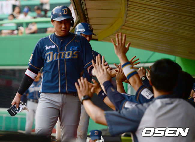 1일 오후 인천 문학구장에서 열린 '2014 한국야쿠르트 세븐 프로야구' SK 번스와 NC 다이노스의 경기, 3회초 2사 만루 테임즈의 2타점 적시타로 홈을 밟은 김태군 김종호가 덕아웃에서 동료들과 하이파이브를 나누고 있다.