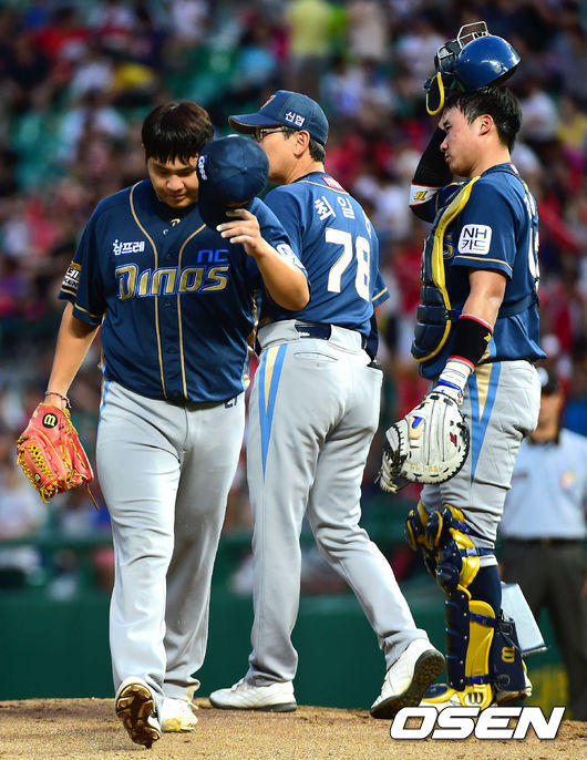 1일 오후 인천 문학구장에서 열린 '2014 한국야쿠르트 세븐 프로야구' SK 번스와 NC 다이노스의 경기, 3회말 무사 만루 상황. NC 선발 노성호가 마운드를 내려오고 있다.