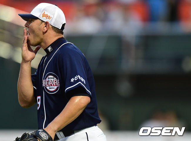 3회말 한화 공격 무사 만루 상황 최진행에게 동점 2타점 적시타를 허용한 두산 새 외국인 투수 마야가 아쉬워하고 있다.