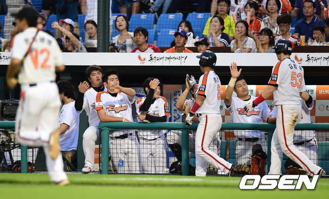 3회말 한화 공격 무사 만루 상황 최진행의 동점 2타점 적시타 때 홈을 밟은 정근우와 김회성이 더그아웃 동료들과 인사를 나누고 있다.