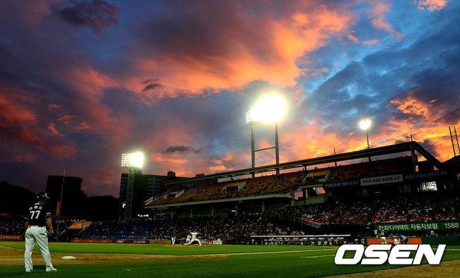 4회초 두산 공격이 진행되고 있는 가운데 저녁 노을이 붉게 물들고 있다.