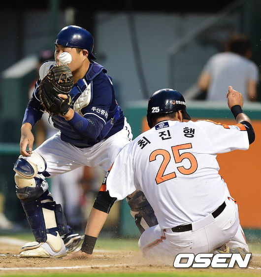 3회말 한화 공격 1사 3루 상황 김태완의 1타점 중견수 희생플라이 때 최진행이 홈으로 태그업해 세이프되고 있다. 두산 포수는 양의지.