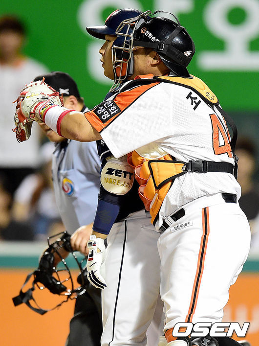 5회초 두산 공격 2사 1, 2루 상황 한화 선발 타투스코의 투구에 몸을 맞은 양의지를 한화 포수 조인성이 말리고 있다.