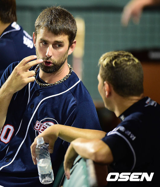 6회초 두산 공격 때 두산 외국인 투수 니퍼트와 새롭게 합류한 외국인 투수 마야가 더그아웃에서 대화를 나누고 있다.