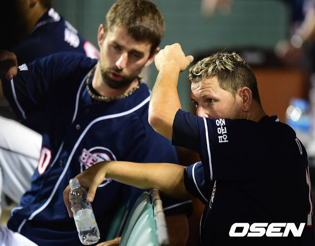 6회초 두산 공격 때 두산 외국인 투수 니퍼트와 새롭게 합류한 외국인 투수 마야가 더그아웃에서 대화를 나누고 있다.