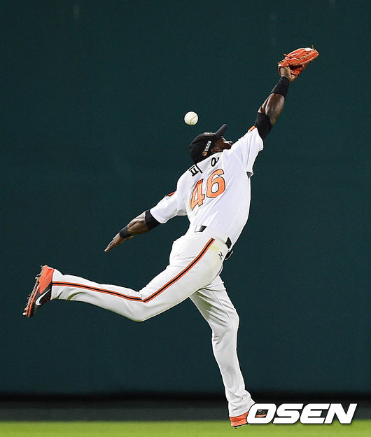 6회초 두산 공격 무사 1루 상황 정수빈의 중견수 키를 넘기는 2루타 때 한화 중견수 피에게 몸을 날려봤지만 아쉽게 놓치고 있다.