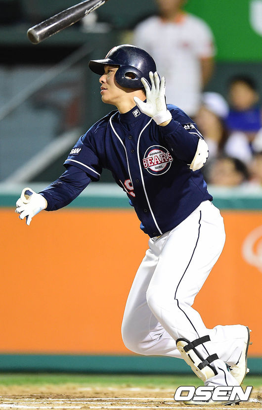 6회초 두산 공격 무사 2, 3루 상황 민병헌이 중견수 키를 넘기는 동점 2타점 적시타를 날리고 있다.