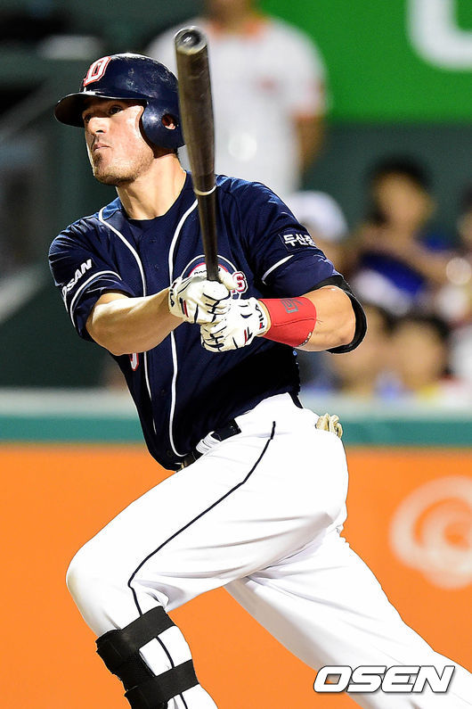 6회초 두산 공격 2사 3루 상황 칸투가 역전 1타점 적시 좌전안타를 날리고 있다.