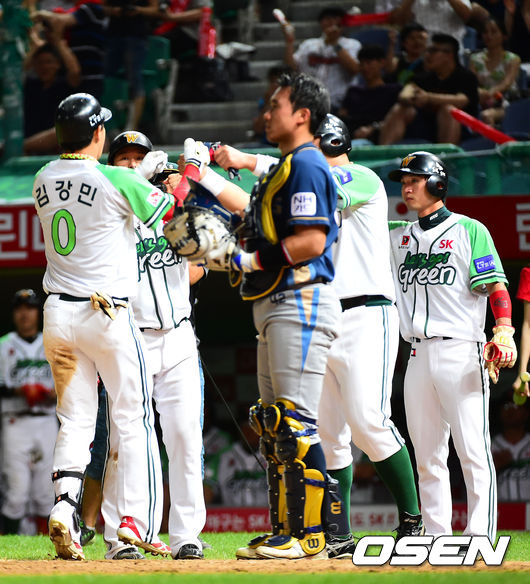 1일 오후 인천 문학구장에서 열린 '2014 한국야쿠르트 세븐 프로야구' SK 번스와 NC 다이노스의 경기, 5회말 2사 만루상황에서 좌중간 담장을 넘기는 홈런을 때린 SK 김강민이 홈에서 동료들과 기쁨의 하이파이브를 나누고 있다.