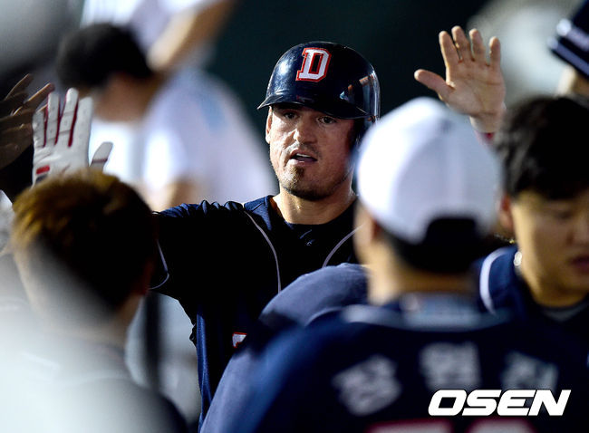 6회초 두산 공격 2사 1, 2루 상황 양의지의 1타점 중전 적시타 때 홈을 밟은 칸투가 더그아웃 동료들과 인사를 나누고 있다.