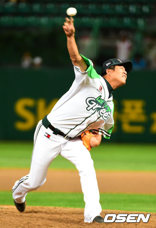 1일 오후 인천 문학구장에서 열린 '2014 한국야쿠르트 세븐 프로야구' SK 번스와 NC 다이노스의 경기, 7회초 SK 이재영이 힘차게 공을 뿌리고 있다.