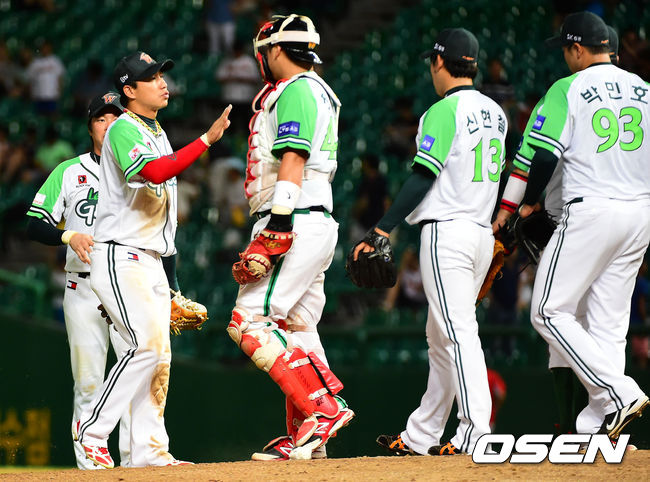 경기종료, 승리한 SK 김강민이 동료들과 기쁨의 하이파이브를 나누고 있다. /ouxou@osen.co.kr