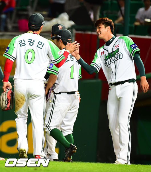 경기종료, 승리한 SK 김강민 김광현이 기쁨의 하이파이브를 나누고 있다. /ouxou@osen.co.kr