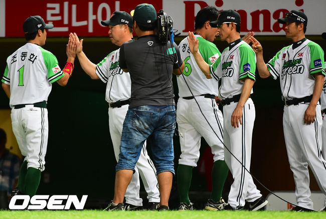 경기종료, 승리한 SK 선수들이 기쁨의 하이파이브를 나누고 있다. /ouxou@osen.co.kr