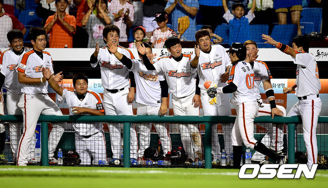 8회말 한화 공격 1사 1, 2루 상황 강경학이 우월 역전 스리런포를 날리고 홈을 밟은 뒤 더그아웃 동료들과 인사를 나누고 있다.