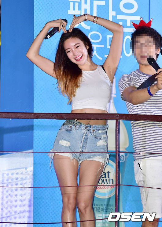 1일 오후 서울 광장동 쉐라톤 그랜드 워커힐 비키니 풀 파티에서 팻다운 미녀 NS윤지가 탱크톱과 핫팬츠를 입고 등장, 자신의 트레이드 마크인 복근 비결을 공개했다.