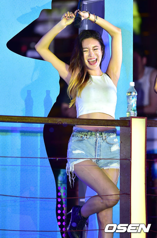 1일 오후 서울 광장동 쉐라톤 그랜드 워커힐 비키니 풀 파티에서 팻다운 미녀 NS윤지가 탱크톱과 핫팬츠를 입고 등장, 자신의 트레이드 마크인 복근 비결을 공개했다.