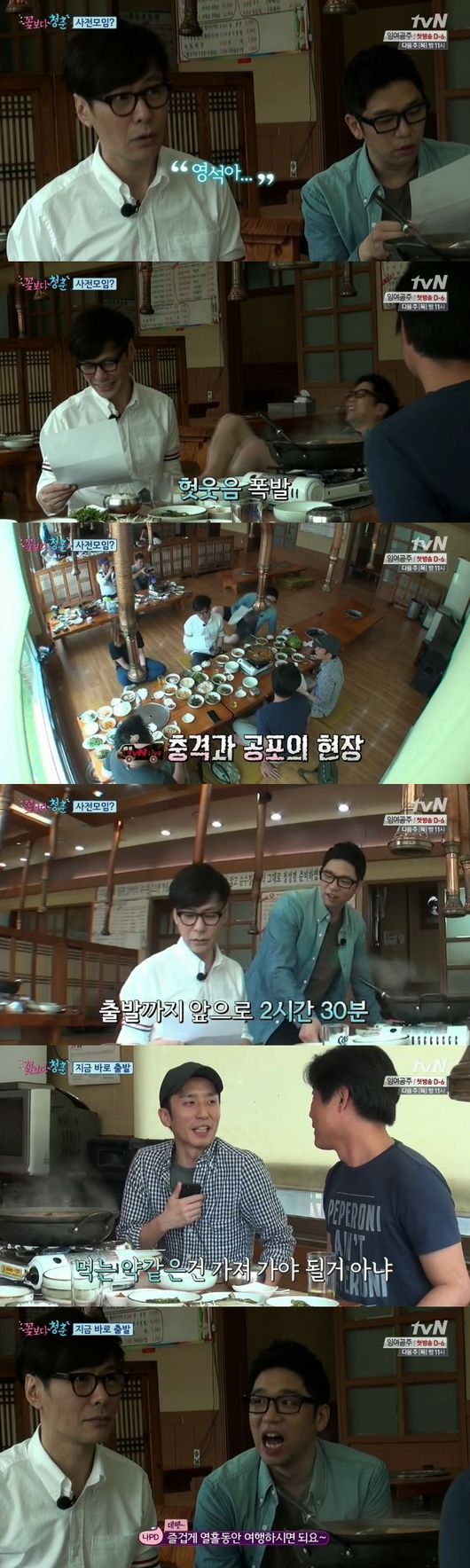 1일 첫방송된 tvN 예능프로그램 '꽃보다 청춘'(연출 나영석 신효정, 이하 '꽃청춘')에서는 나영석PD가 내민 비행기 티켓의 날짜를 보고 놀라는 유희열-이적-윤상의 모습이 그려졌다. 적힌 날짜가 사전 모임을 하는 바로 그 날이었던 것.