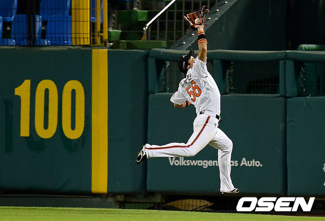 9회초 두산 공격 선두타자로 나선 양의지의 타구를 한화 우익수 고동진이 끝까지 쫓아가 점프하며 잡아내고 있다.