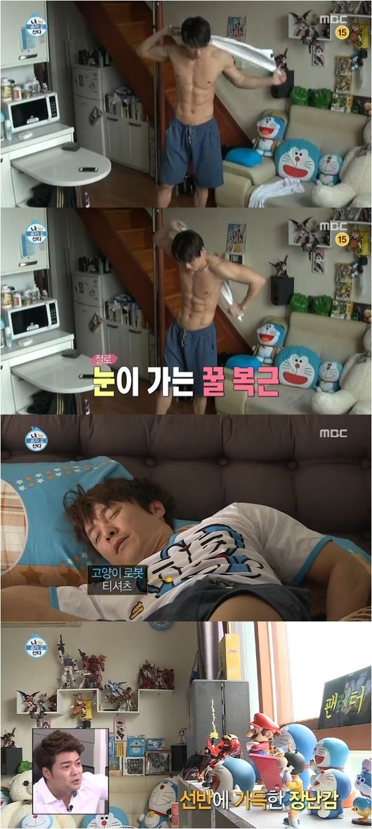 그런가하면 도라에몽 마니아의 모습을 보였다. 집안 한구석에는 도라에몽 인형과 장난감, 피규어가 가득했다. 또한 그는 잠옷도 도라에몽 티셔츠였다. 하루를 피규어를 닦으며 시작한 반전 매력을 가지고 있는 남자였다. 그는 이날 도라에몽을 사랑하는 이유에 대해 “어렸을 때 돈이 없어서 장난감이 거의 없었다. 돈을 번 다음에 어렸을 때 못했던 것을 하게 됐다”라고 털어놨다.
