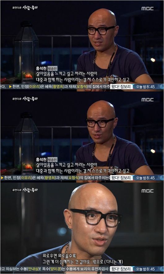 홍석천은 2일 방송된 MBC 교양프로그램 ‘휴먼다큐 사람이 좋다’에서 바쁘게 활동하는 이유에 대해 “살아 있음을 느끼고 싶다. 나란 사람이 대중과 함께라는 생각을 갖고 있다”고 운을 뗐다.