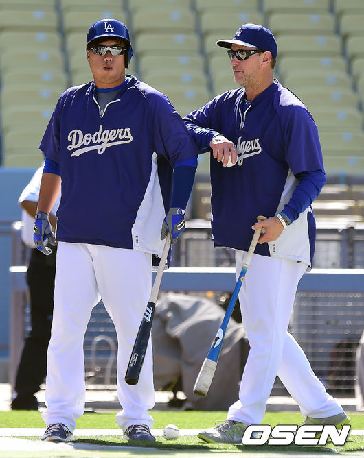 2일(한국시간) 미국 캘리포니아주 로스앤젤레스 다저스타디움에서 열리는 '2014 메이저리그' LA 다저스와 시카고 컵스의 경기에 앞서 다저스 류현진이 팀 월락 수석코치와 장난을 치고 있다.