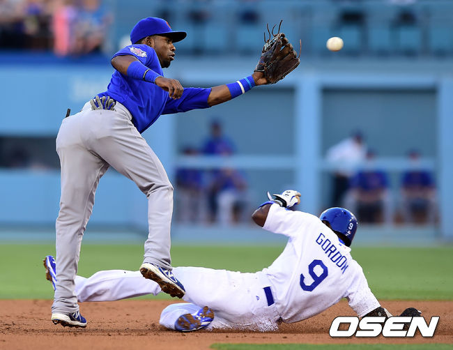 1회말 무사 1루 다저스 디 고든이 2루를 성공하고 있다.
