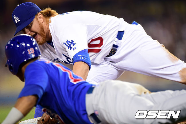 5회초 1사 만루 다저스 터너가 시카고 카스티요의 적시타로 3루까지 진루하던 카스트로를 태그하고 있다.