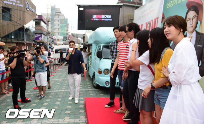2일 오후 서울 홍대입구 상상마당 앞 주차장 거리에서 열린 영화 '내 연애의 기억' 쇼케이스에서 강예원이 팬들과 기념촬영을 하고 있다.