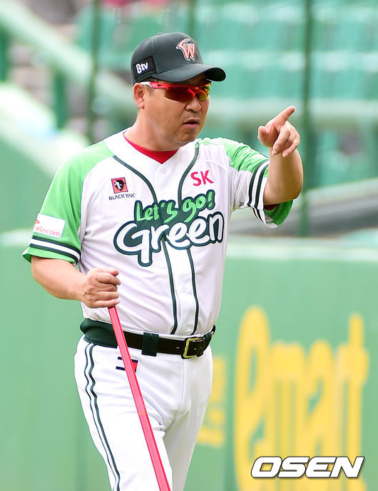 2일 오후 인천 문학야구장에서 열린 '2014 한국야쿠르트 세븐 프로야구' SK 와이번스와 NC 다이노스의 경기, 경기에 앞서 SK 이만수 감독이 더그아웃으로 향하며 손짓하고 있다.