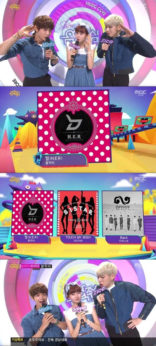 블락비는 신곡 '헐(H.E.R)'으로 2일 오후 생방송으로 진행된 MBC '쇼! 음악중심'에서 씨스타 '터치 마이 바디(TOUCH MY BODY)', 인피니트의 '백(Back)'과 1위 경쟁을 벌이게 됐다.