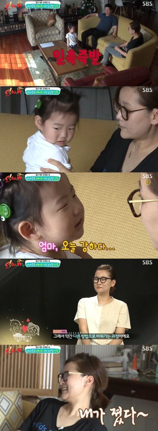 박선주는 2일 오후 방송된 SBS 예능프로그램 '오 마이 베이비'에서 아빠 강레오의 휴대폰을 던지는 에이미의 행동에 화가 나 이를 혼내려했다.
