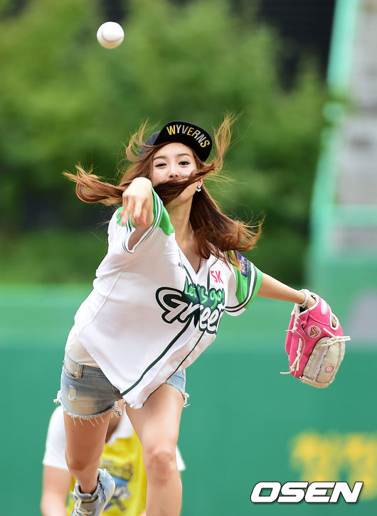 2일 오후 인천 문학야구장에서 열린 '2014 한국야쿠르트 세븐 프로야구' SK 와이번스와 NC 다이노스의 경기, 경기에 앞서 SBS SPORTS 홍재경 아나운서가 시구를 하고 있다.