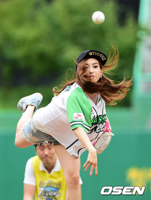 2일 오후 인천 문학야구장에서 열린 '2014 한국야쿠르트 세븐 프로야구' SK 와이번스와 NC 다이노스의 경기, 경기에 앞서 SBS SPORTS 홍재경 아나운서가 시구를 하고 있다.